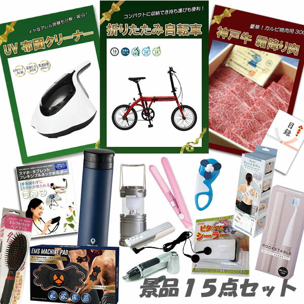 二次会 景品 ビンゴ 景品 15点セット 折りたたみ自転車 神戸牛霜降りカルビ UV布団クリーナー ヘアアイロン 他 パネル 目録 結婚式 二次会 景品 おもしろ